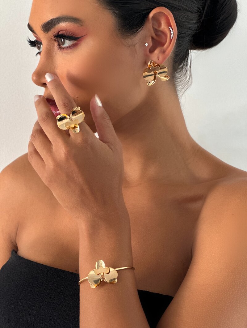 Conjunto Folheado a Ouro 18K Anel, Bracelete e Brinco Geométrico