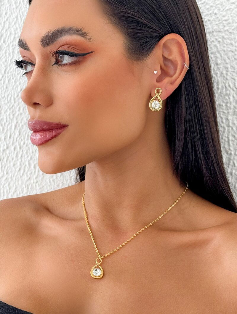 Conjunto Folheado a Ouro 18K Colar e Brinco Gota com Ponto de Luz