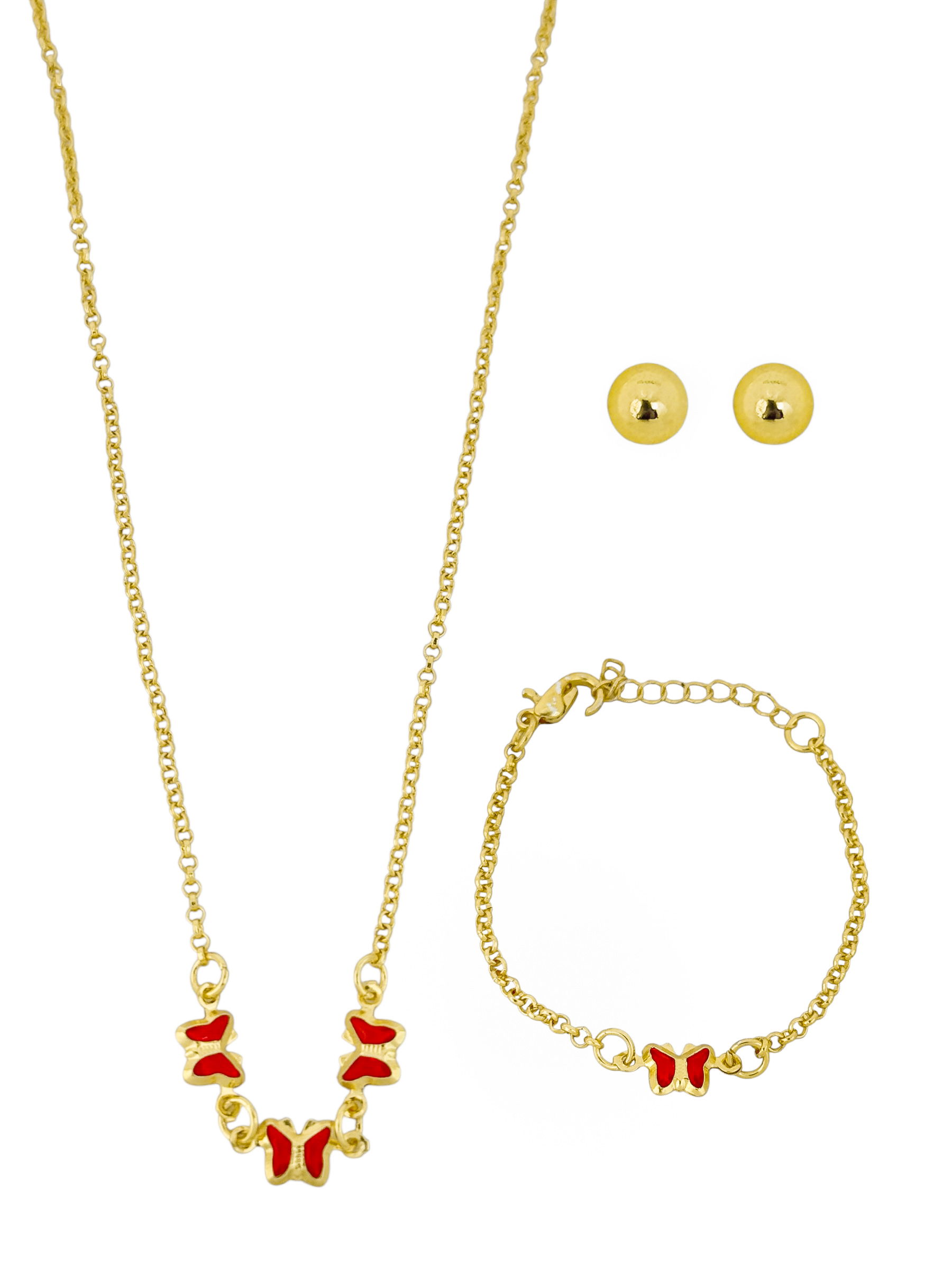 Conjunto Infantil Colar, Brinco e Pulseira Folheado a Ouro 18k Borboletas Com Esfera
