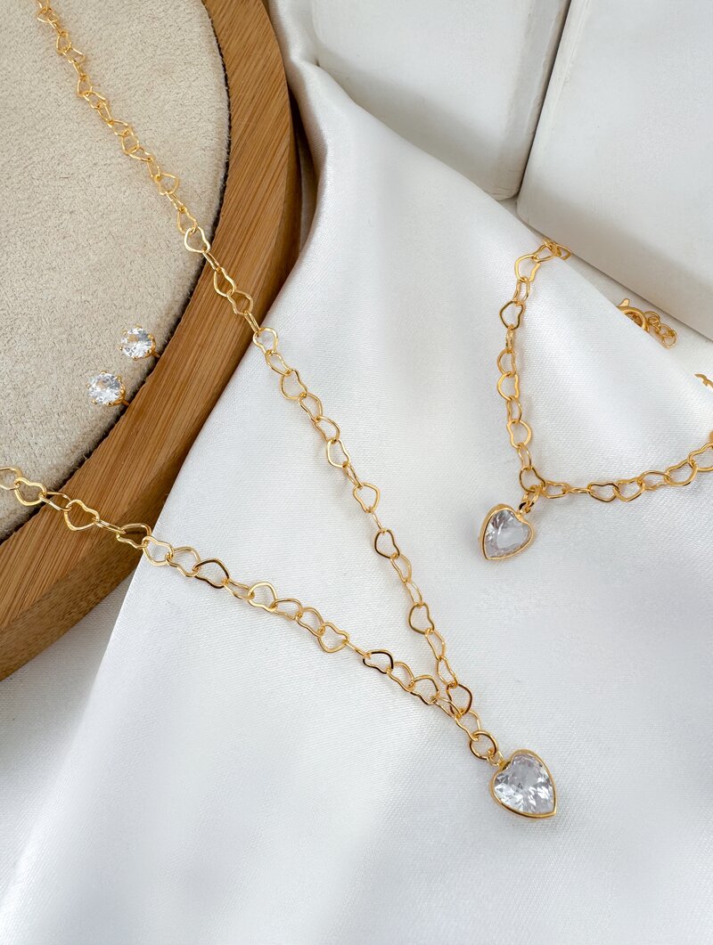 Conjunto Infantil Colar, Brinco e Pulseira Folheado a ouro 18k com Corações de Zircônia