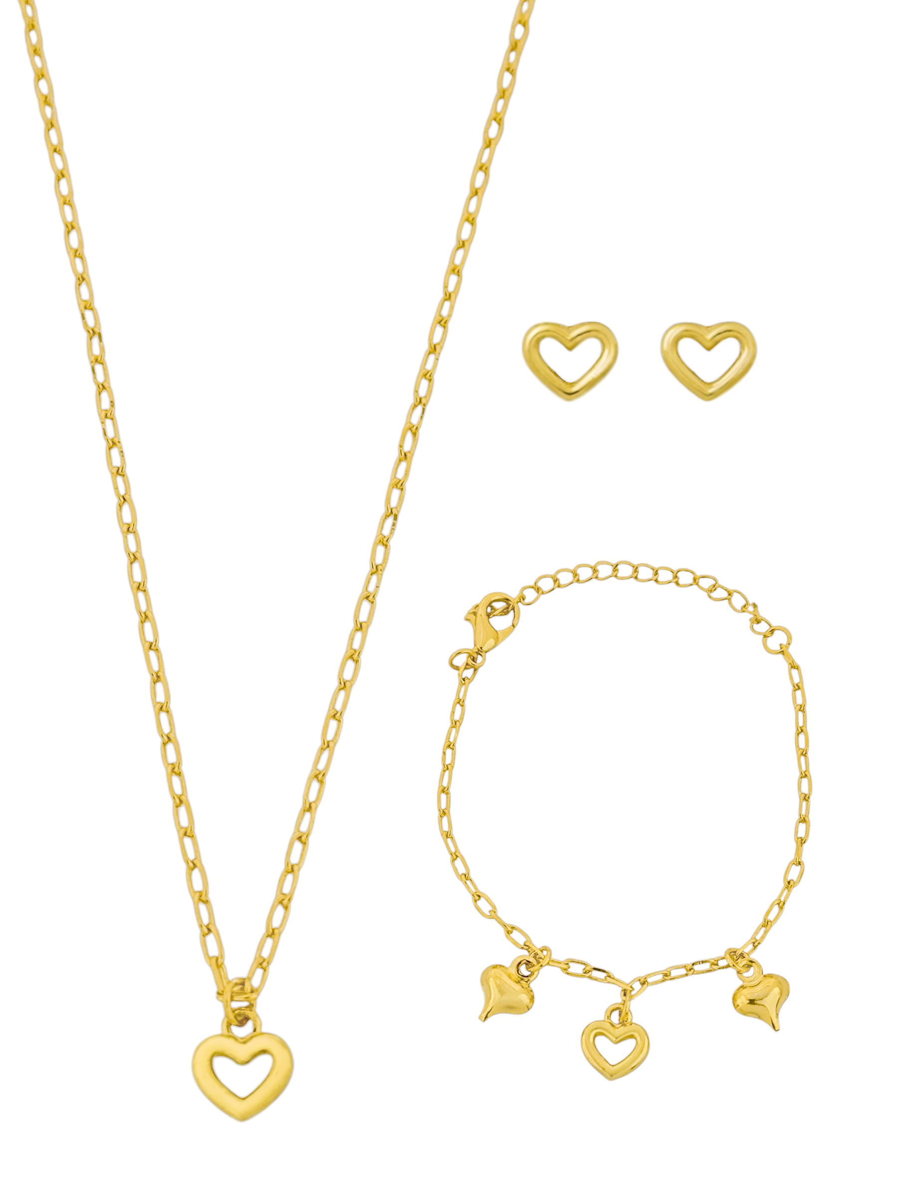 Conjunto Infantil Colar, Brinco e Pulseira Folheado a Ouro 18k Corações Vazado