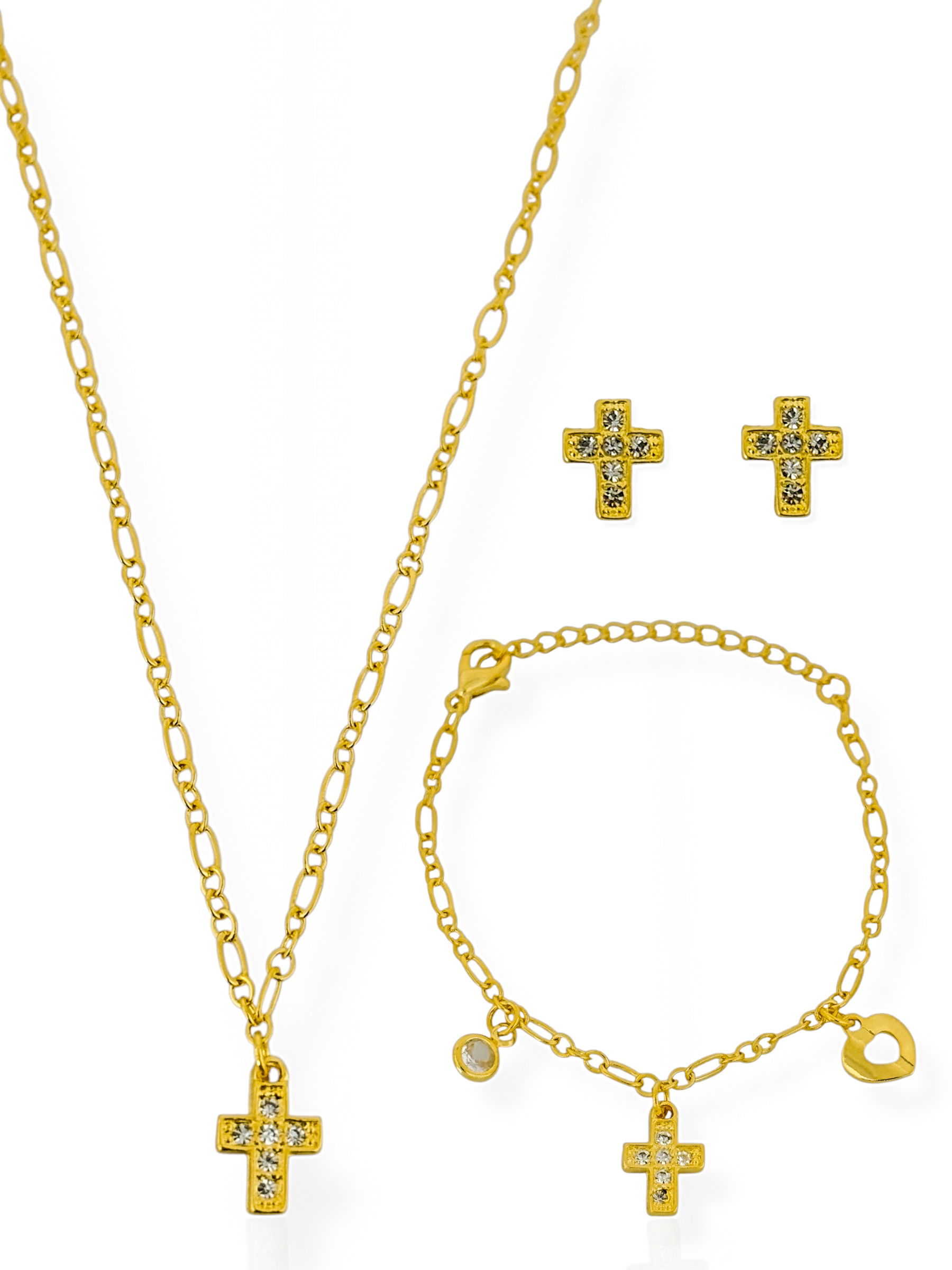 Conjunto Infantil Colar, Brinco e Pulseira Folheado a Ouro 18k e Prata Cruz Cravejada