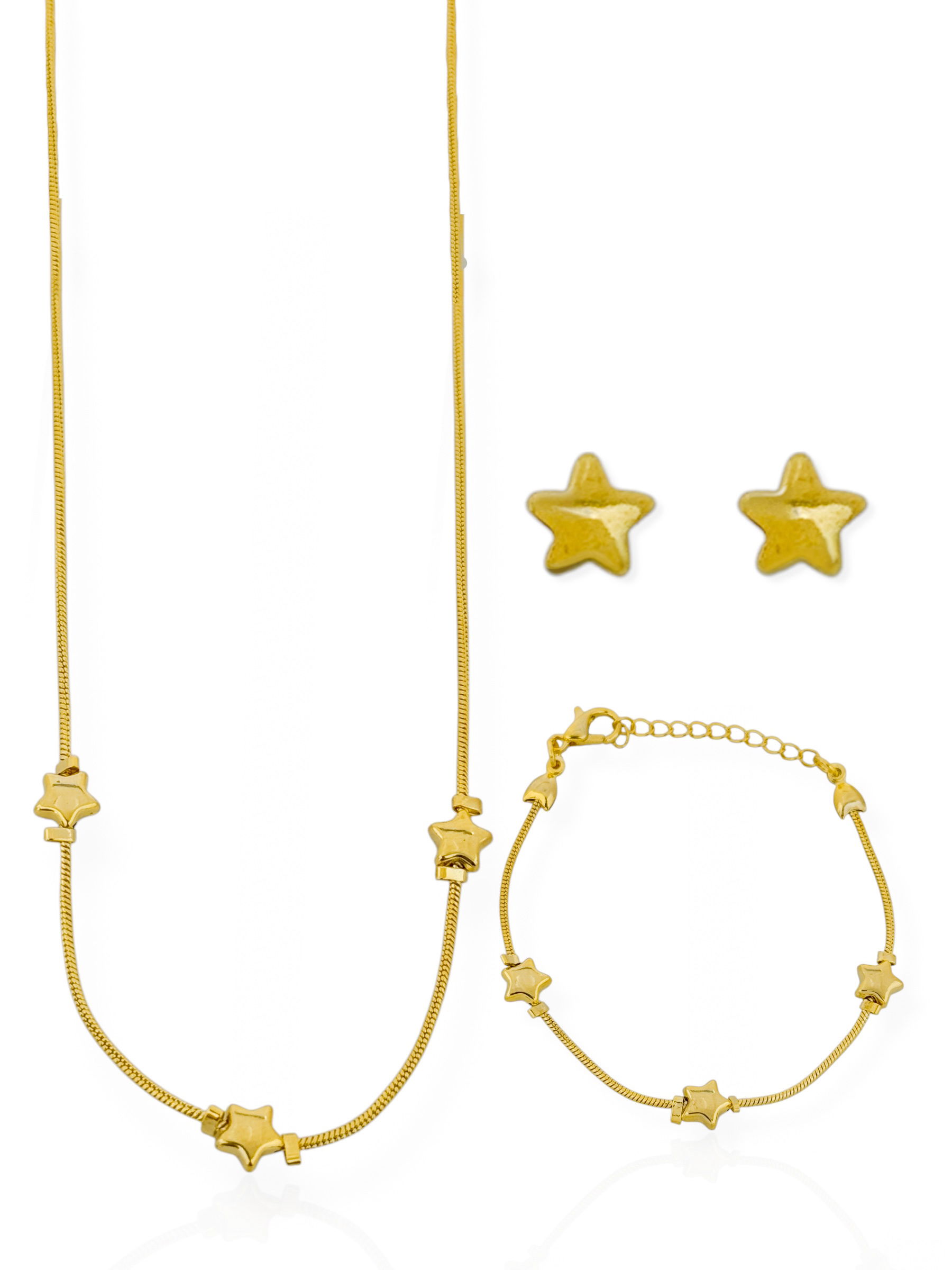 Conjunto Infantil Colar, Brinco e Pulseira Folheado a Ouro 18k Estrelas