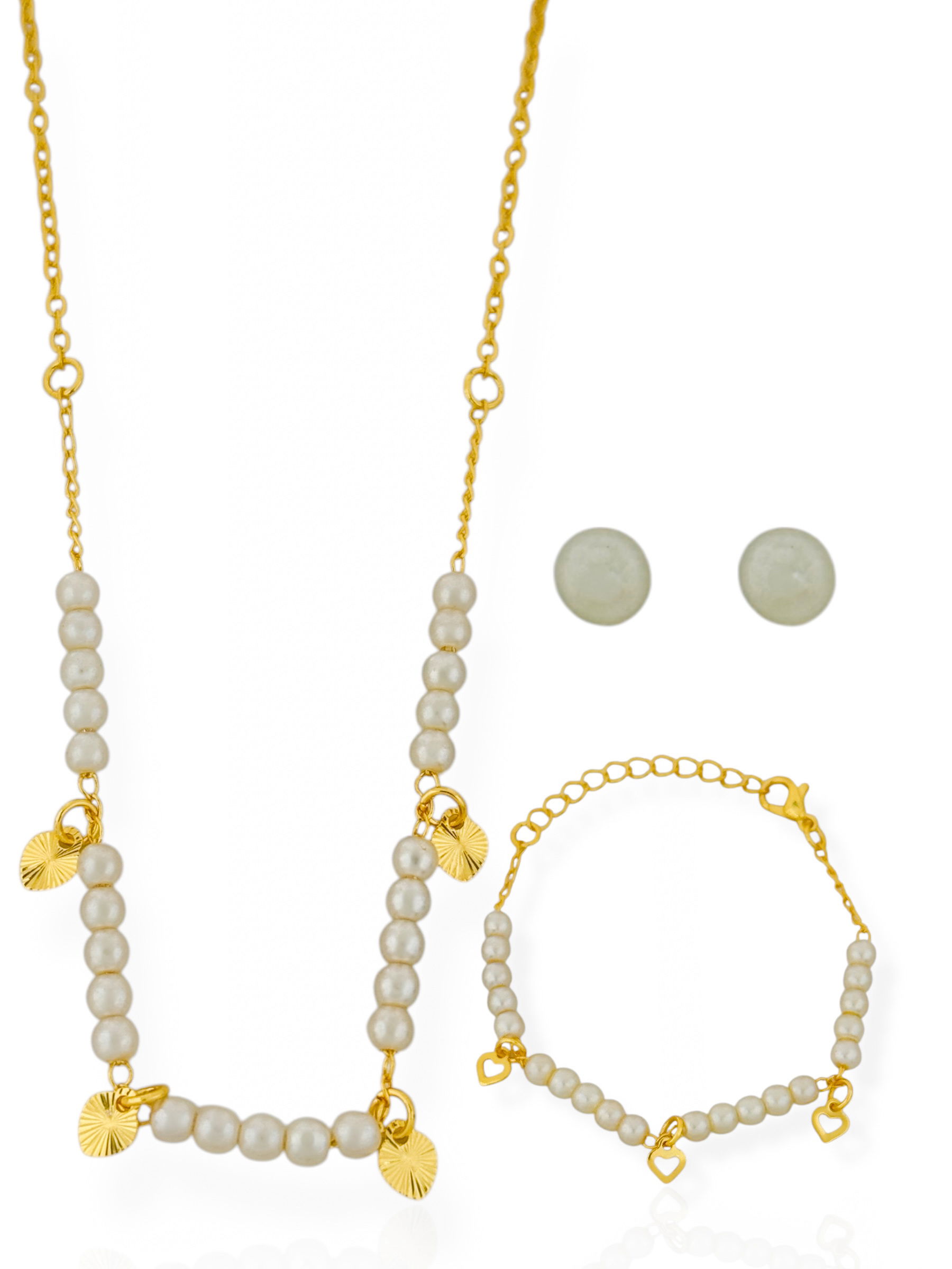 2. Conjunto Infantil Colar, Brinco e Pulseira Folheado a Ouro 18k Pérolas Com Mini Coração