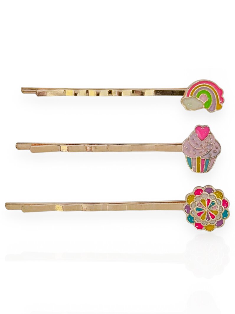 3. Grampo de Cabelo Infantil Folheado a Ouro 18k Cupcake, Flor e Arco-Íris Colorido