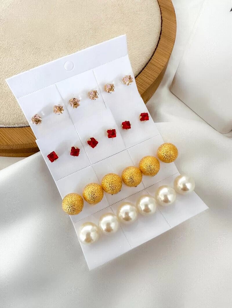 3. Kit Doze Pares De Brinco Folheados a Ouro 18k Ponto De Luz, Pérola M e Esfera Escovada