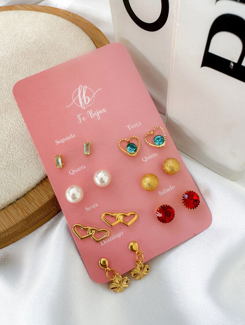 3. Kit Semaninha Folheada a Ouro 18k Corações, Zircônias, Trevo e Pérola
