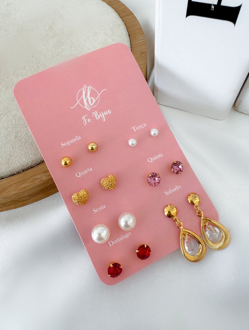 3. Kit Semaninha Folheado a Ouro 18k Pérolas, Zircônias, Coração e Argola Gota