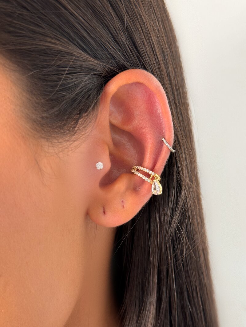 3. Piercing Fake Folheado a Ouro 18k e Prata Dois Fios Cravejados e Gota de Zircônia