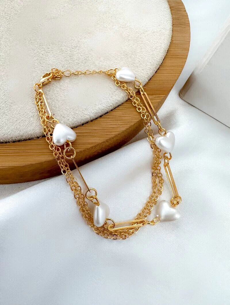 3. Pulseira Folheada a Ouro 18k Corações de Pérolas com Entremeios