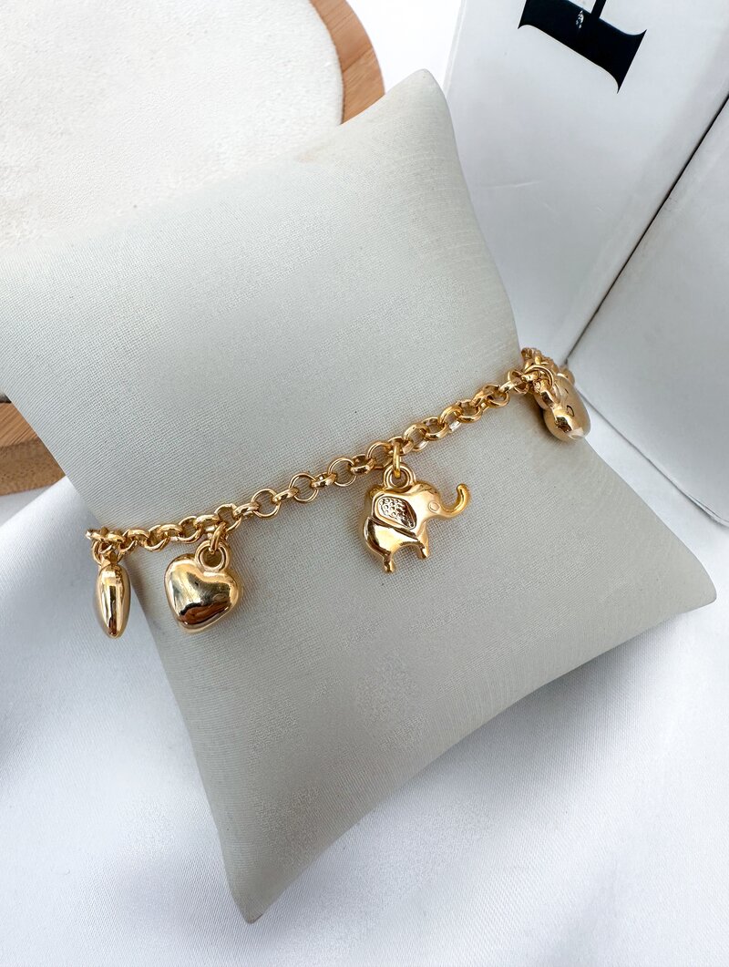 Pulseira Folheada a Ouro 18k Corações Lisos com Elefante