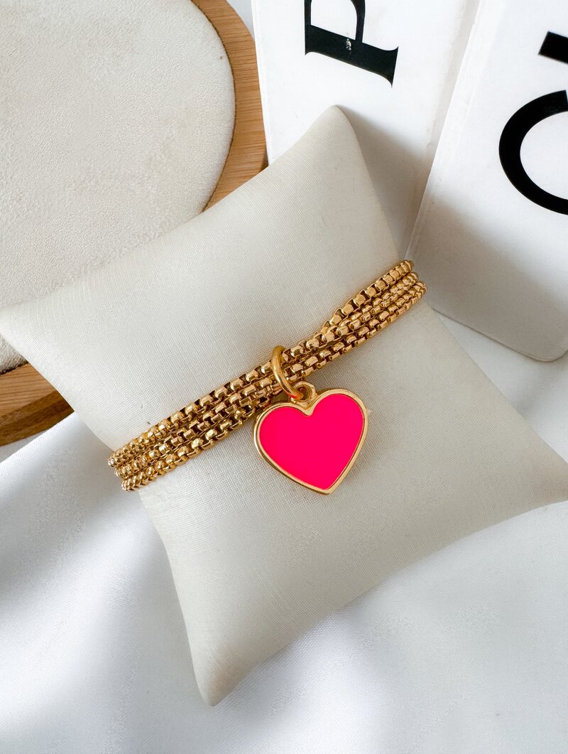 3. Pulseira Folheada a Ouro 18k Corrente Quadrada com Coração Rosa