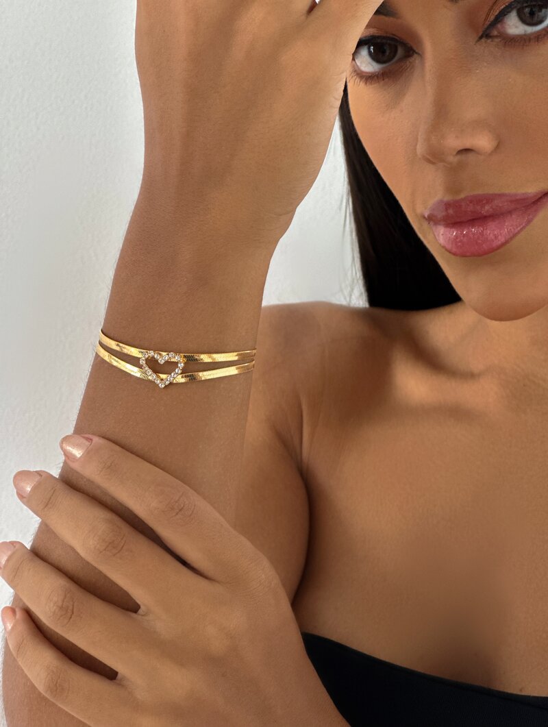 Pulseira Folheada a Ouro 18k Dois Fios Fita Laminada com Coração Cravejado