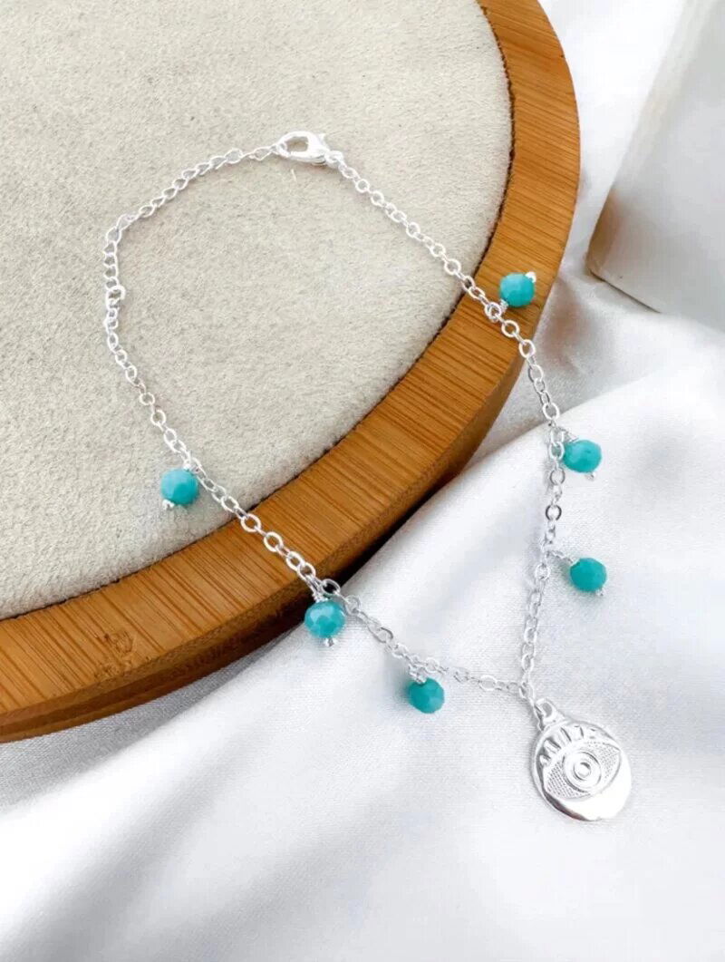 3. Pulseira folheada a ouro 18k e prata 925 de pedras azuis e olho grego.