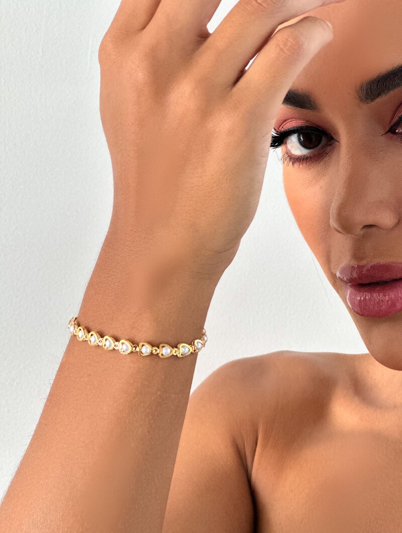 3. Pulseira Folheada a Ouro 18k e Prata Corações com Pérolas