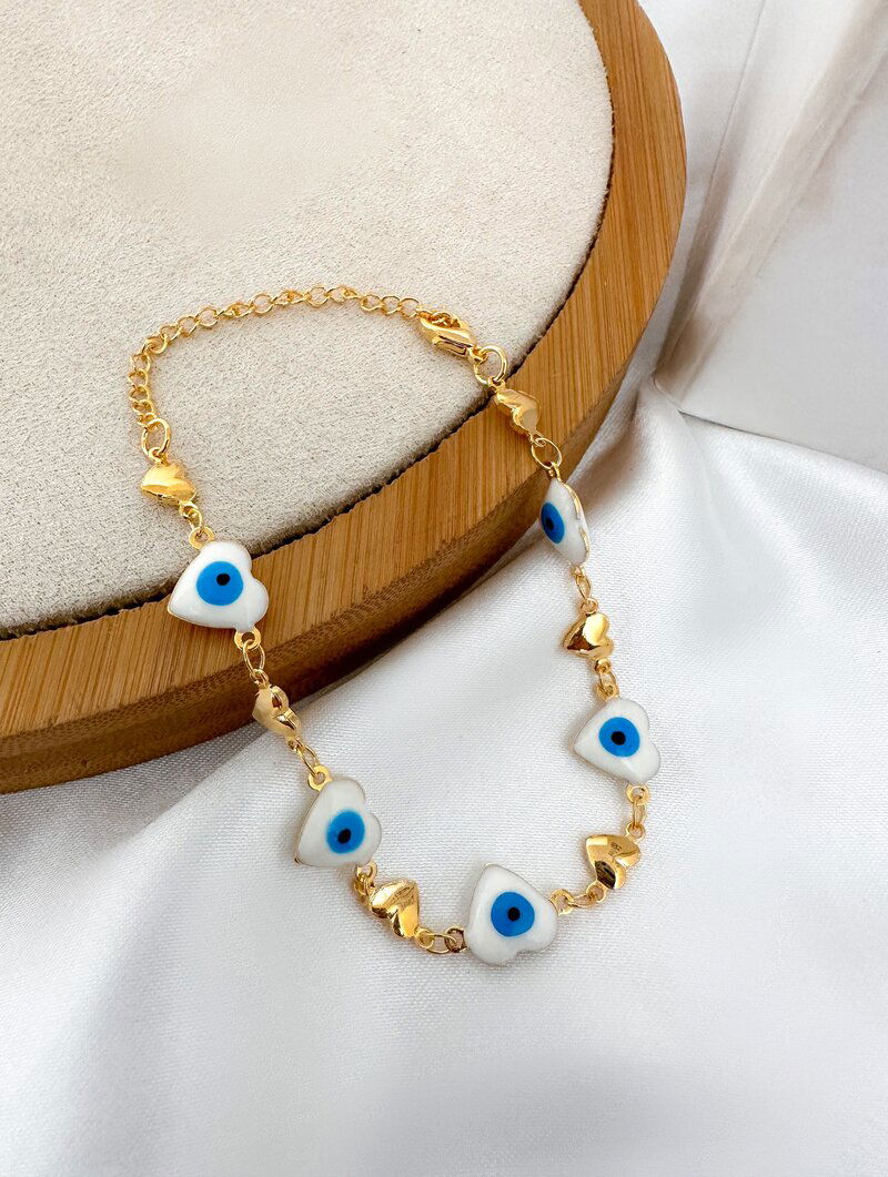 3. Pulseira Folheada a Ouro 18k e Prata Corações e Olho Grego