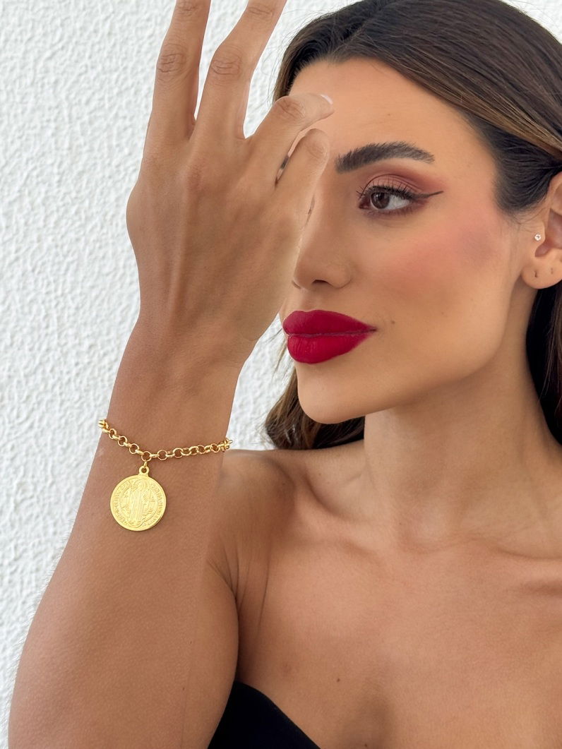 Pulseira Folheada a Ouro 18k Elos Redondos e Medalha de "São Bento"