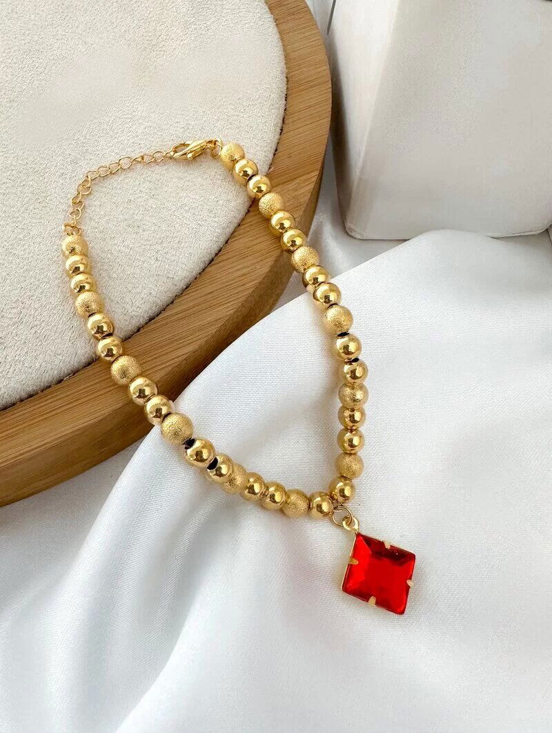 3. Pulseira Folheada a Ouro 18k Esferas com Pedra Vermelha