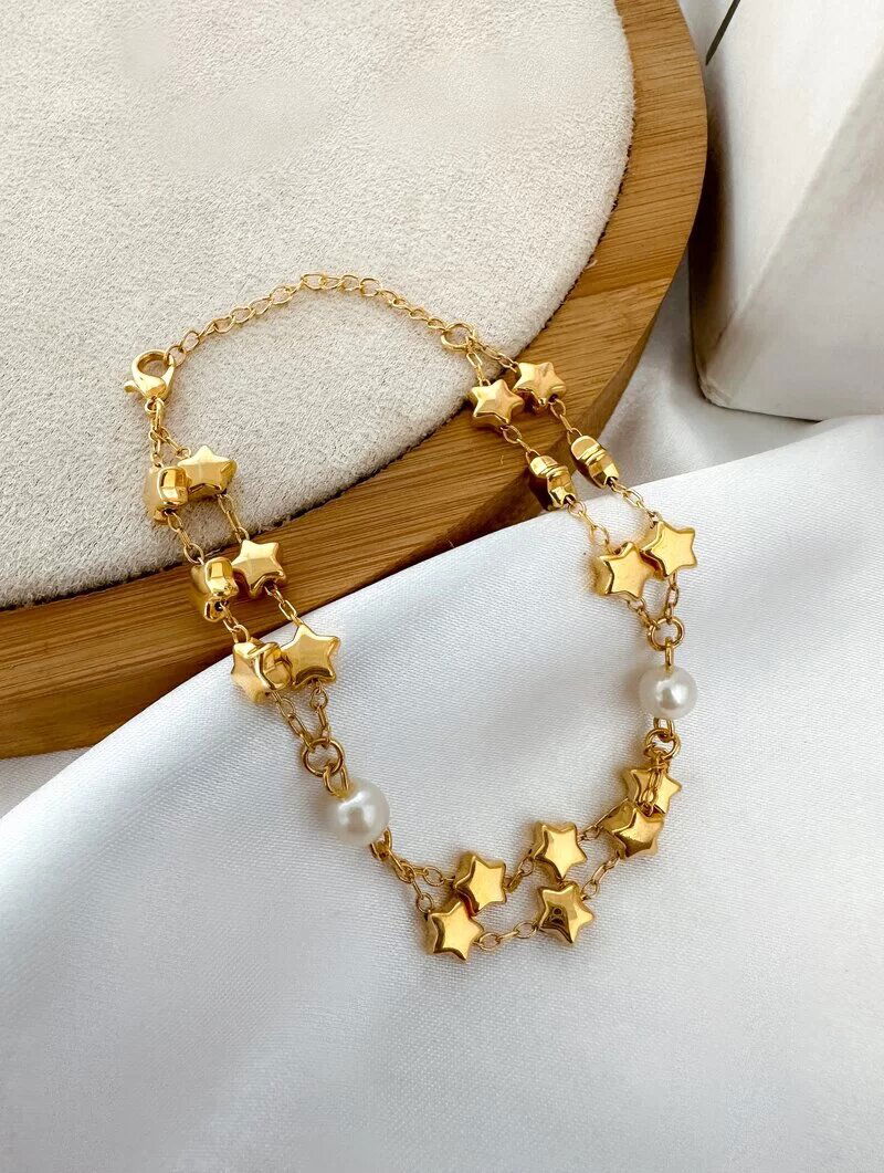 3. Pulseira Folheada a Ouro 18k Estrelas e Pérolas