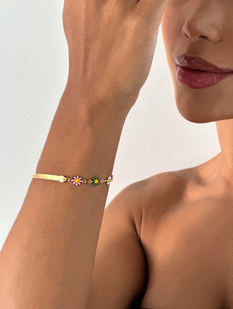 3. Pulseira Folheada a Ouro 18k Margaridas Coloridas com Fita Laminada