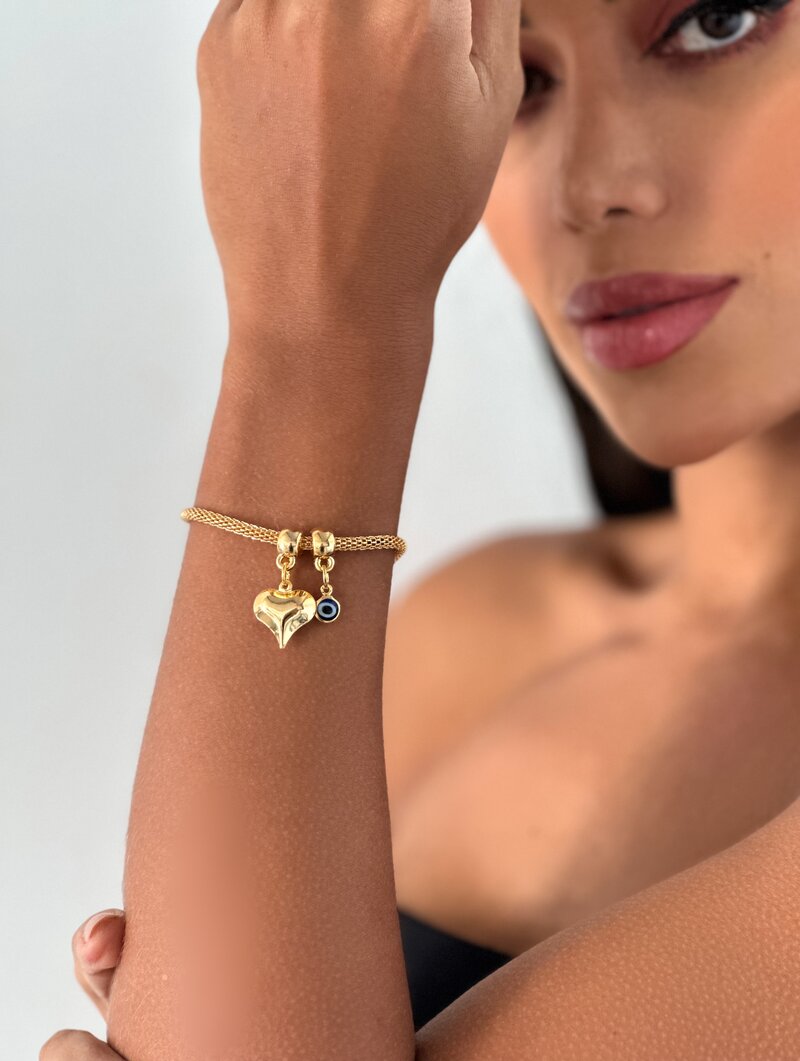 3. Pulseira Folheada a Ouro 18k Rabo de Tatu com Pingentes Coração e Olho Grego