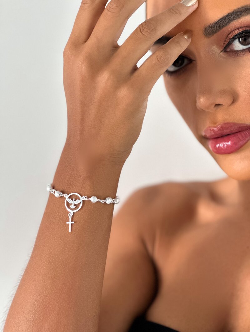 3. Pulseira Folheada a Prata 925 Esferas Texturizadas com Pingente Espírito Santo