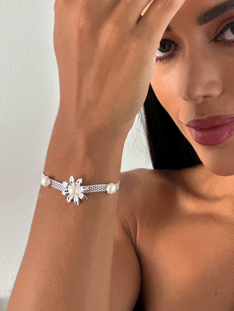 3. Pulseira Folheada a Prata 925 Malha com Flor e Pérola