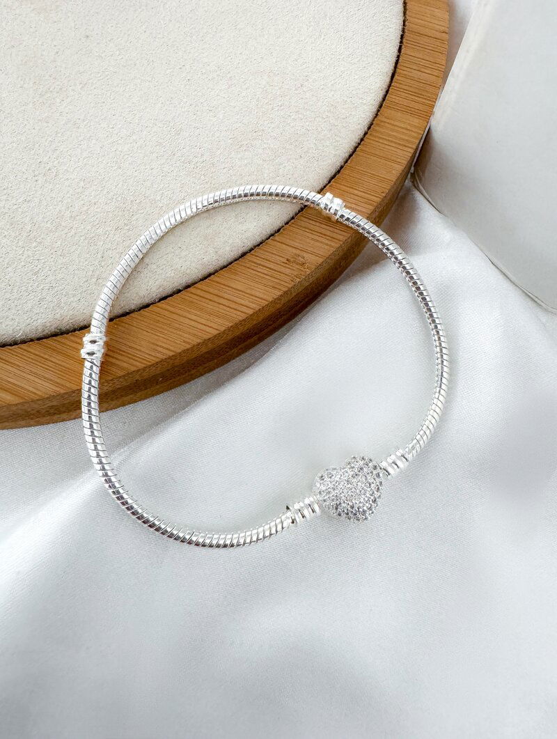 Pulseira Folheada a Prata 925 para Berloques Fecho Click Coração Cravejado