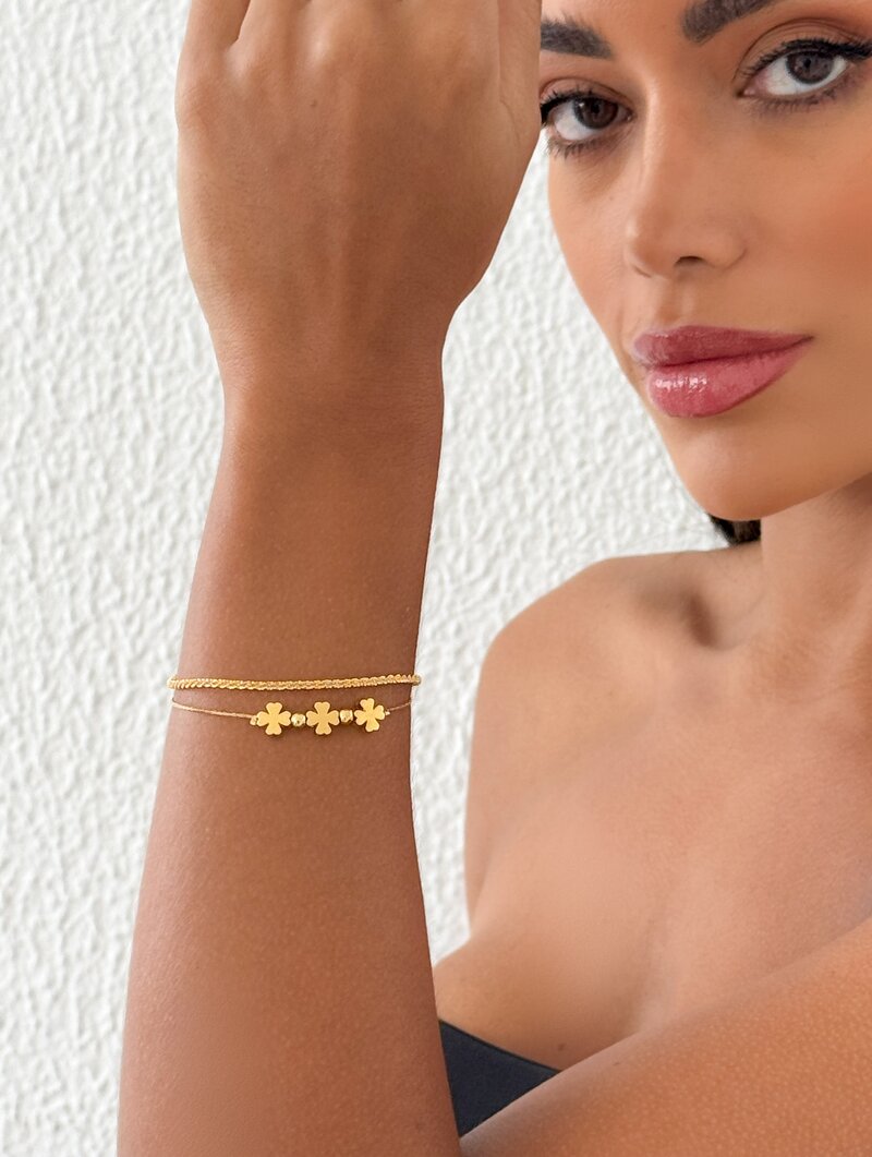 3. Pulseira Folheado a Ouro 18k Dois Fios Cordão Torcido e Flores