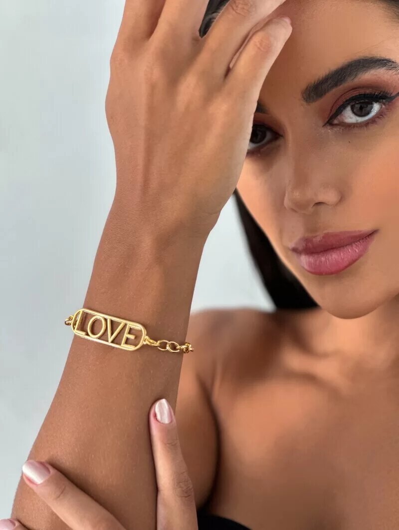 3. Pulseira folheado a ouro 18k elo portugues "love".