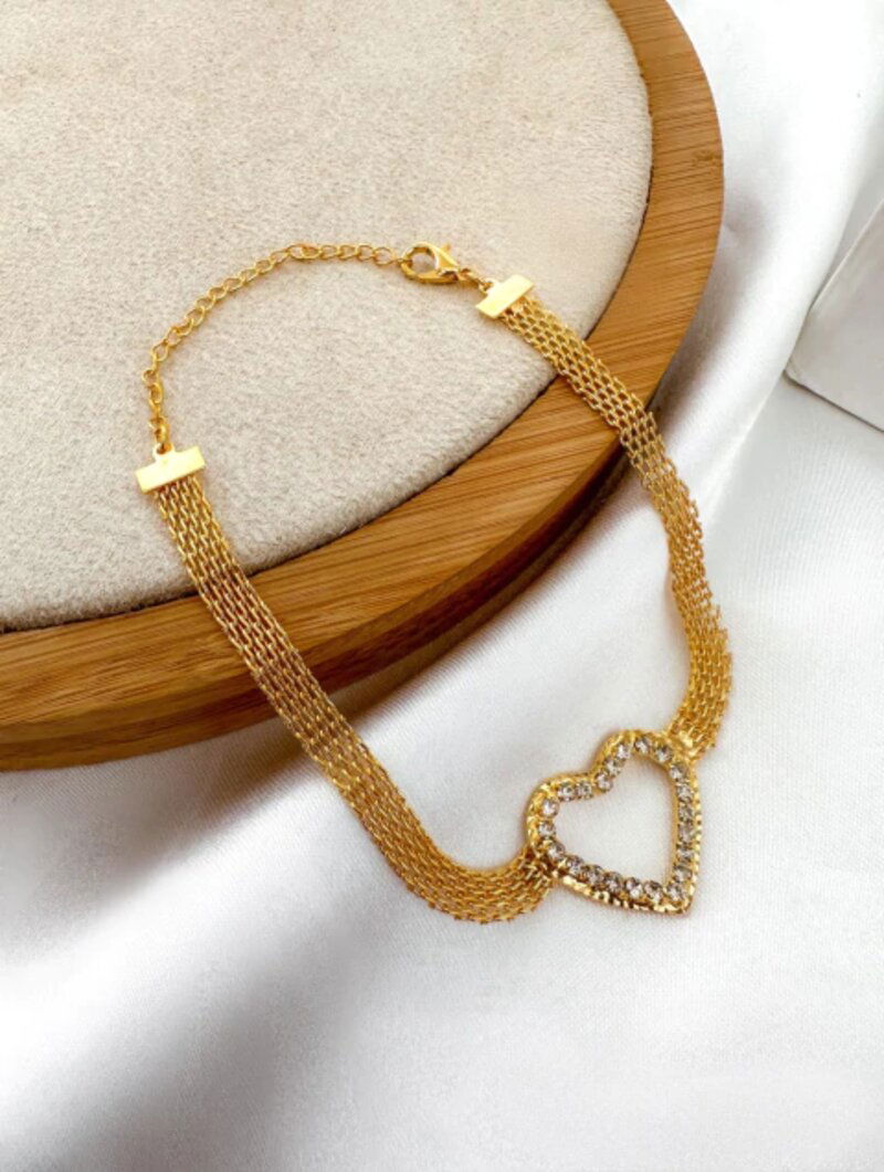 3. Pulseira malha folheado a ouro 18k com coração vazado bordas de zircônias.