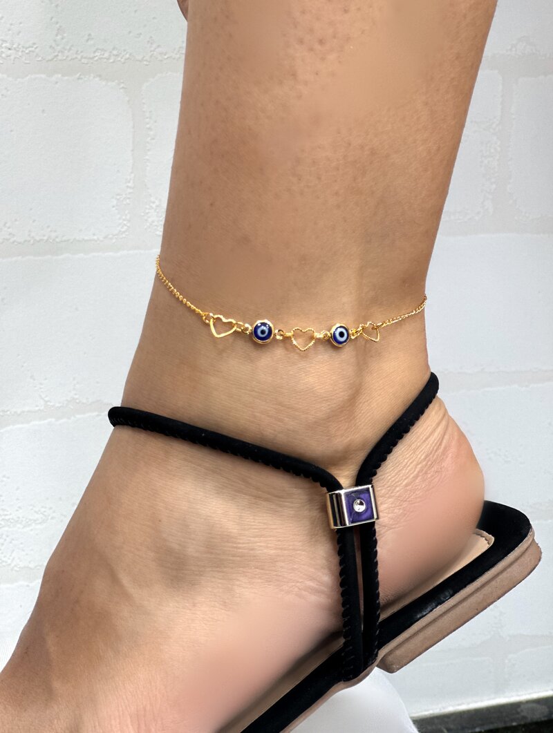2. Tornozeleira Folheada a Ouro 18k Corações Vazados com Olho Grego