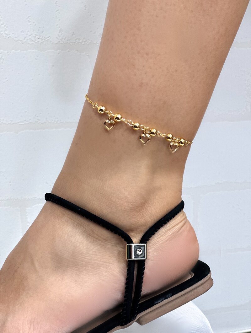 2. Tornozeleira Folheada a Ouro 18k Esferas com Corações Vazados