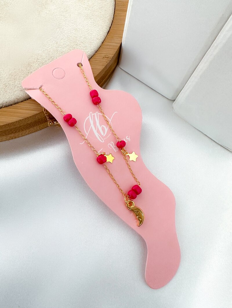 2. Tornozeleira Folheada a Ouro 18k Miçangas Rosa com Lua e Estrela
