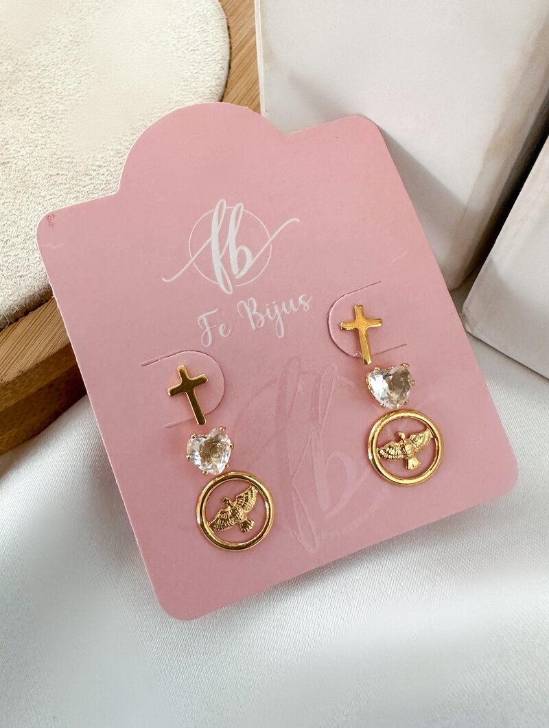 3. Trio de Brinco Folheado a Ouro 18k Cruz, Coração e Espírito Santo
