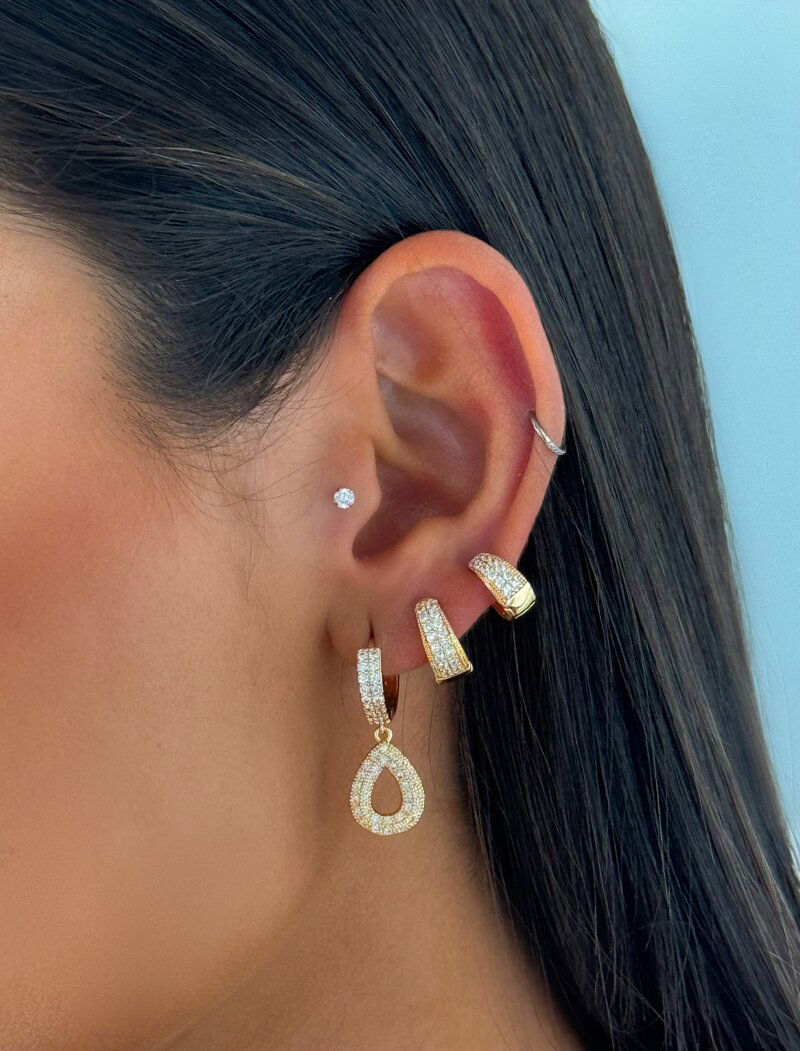 3. Trio de Brinco Folheado a Ouro 18k e Prata Argolas e Gota Cravejada