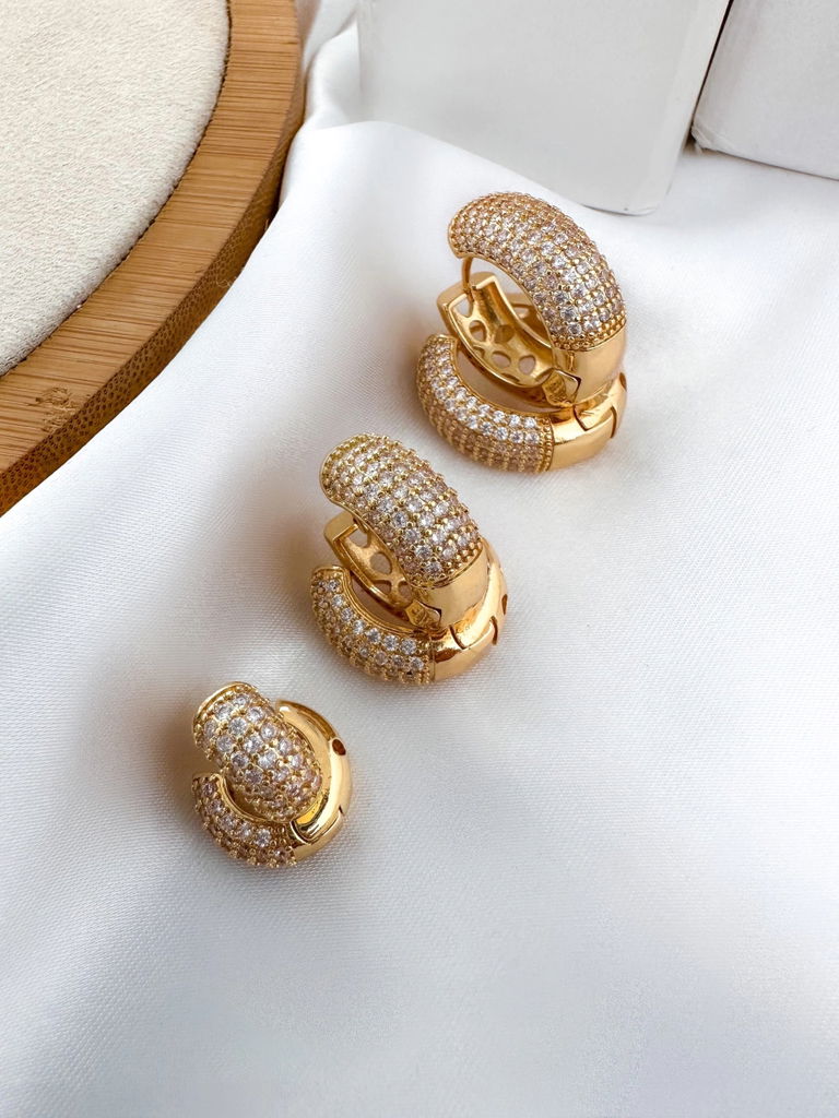 trio de brincos folheado a ouro 18k e prata 925 argolas cravejadas com micro zircônias e detalhe vazado.