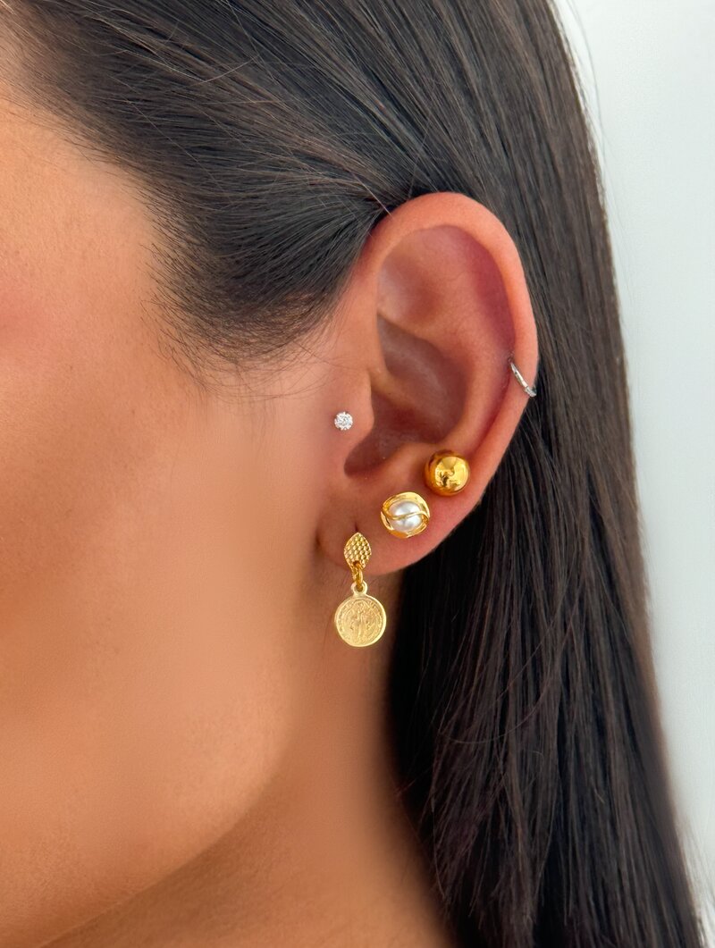 Trio de Brincos Folheado a Ouro 18k Pérola, Esfera e Medalha São Bento