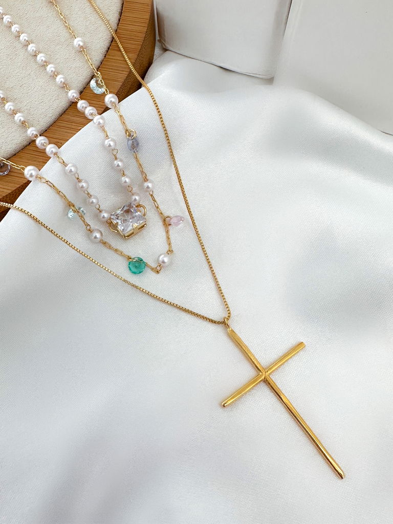 trio de joinha folheado a ouro 18k e prata 925 pérolas e ponto de luz com pingente de crucifixo