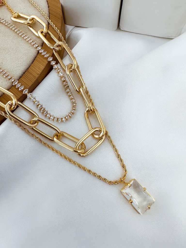 2. trio de joinhas folheado a ouro 18k e prata 925 elos, cordão baiano, zircônias com pingente pedraria