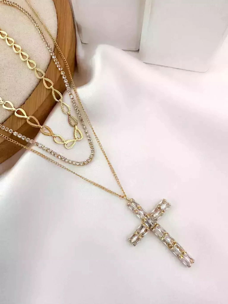 2. trio de joinhas folheado a ouro 18k e prata 925 elos, zircônias e crucifixo.