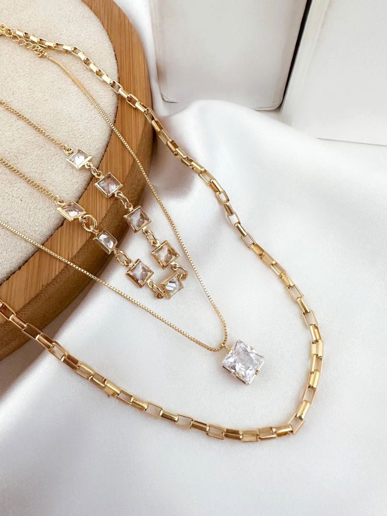 trio de joinhas folheado a ouro 18k e prata 925 quadrados de zircônias e elos.