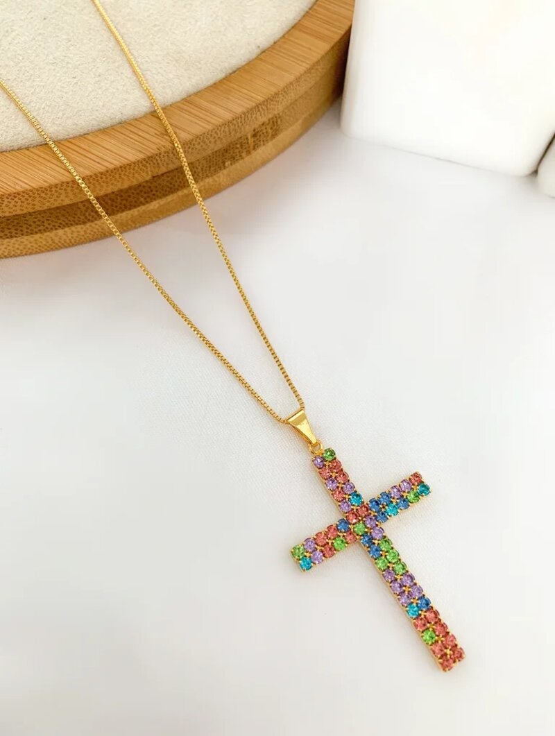 3. Veneziana folheada a ouro com crucifixo de zircônias coloridas